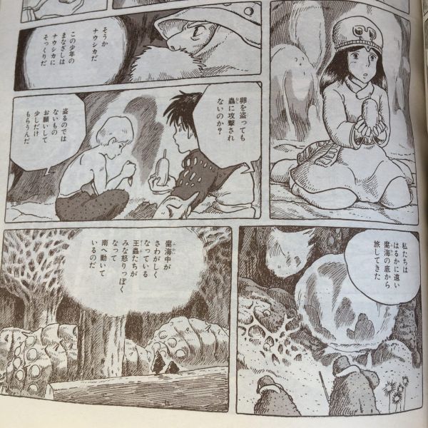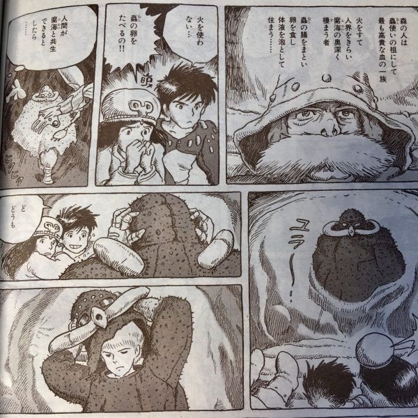 「森の人は、火をすて、人界を嫌い、腐海の奥深く棲まう者、蟲の腸をまとい、卵を食し…人間が腐海と共生できるとしたら…」そこへ、森の人が、蟲の体液でできた泡の壁の向こうから、中に入ってきた…