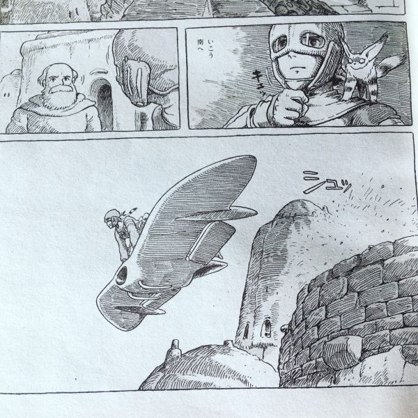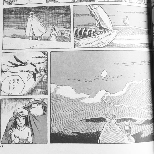 眼下に広がるサパタの村と、畑と、地平線の上には青い空と白い雲と、そしてさらにその先には…「いこう、南へ」南という言葉をのみ込むようにナウシカは、帽子のあご紐をキュッと締めた、肩にはテト…