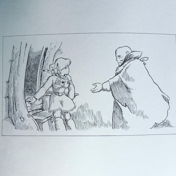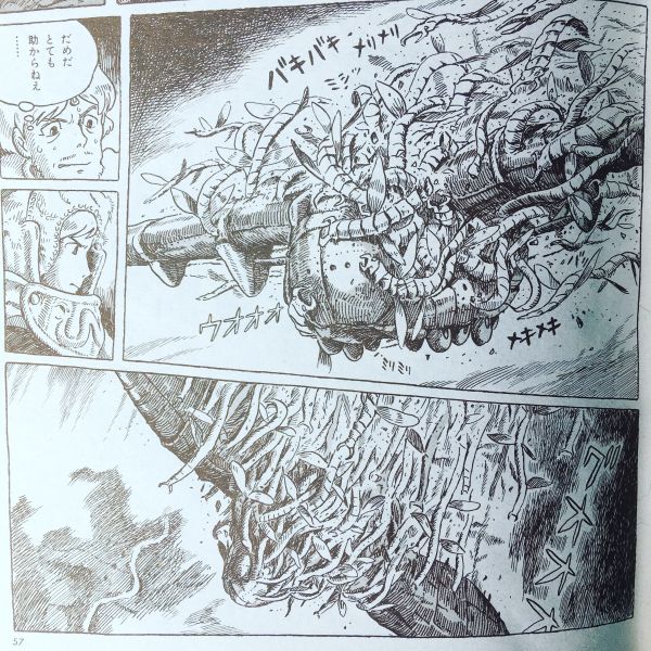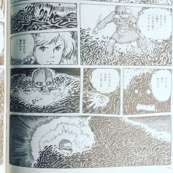 いつの間にか闇の渦はナウシカとチククをすっかり囲みつくし、「お前のあたたかい心臓をこの手で握りつぶしてやる」その暗い触手をさらに伸ばしてくる、ついに靴の先に触れる、足もとから這い上がってくるのを感じながらナウシカは、「おびえたら、くわれる…」