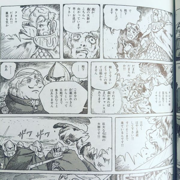 血まみれにひしゃげた頬にクロトワはニヤリと笑みを浮かべ、「くたばってたまるか…」、クシャナは、クロトワのボロボロの体を肩に担ぎ、背中に抱きあげた、右手に剣を握ったまま、再びクシャナは走りだした…