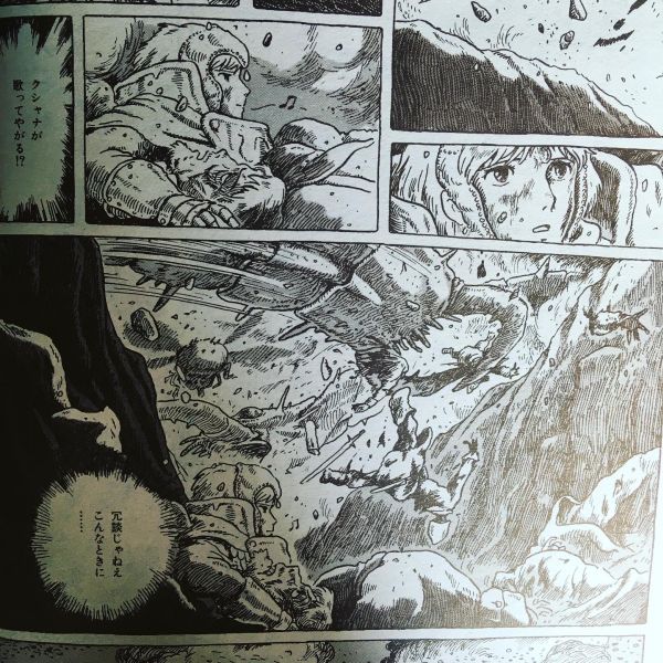「クシャナが歌ってやがる!?」塹壕の外は何も変わっていない、次から次へと蟲が飛び交い、引き裂かれた人間の体が時折降ってくる、それが目に入っているのかいないのか、ただ歌を歌いつづけている、クシャナ。「冗談じゃねぇ、こんなときに…」