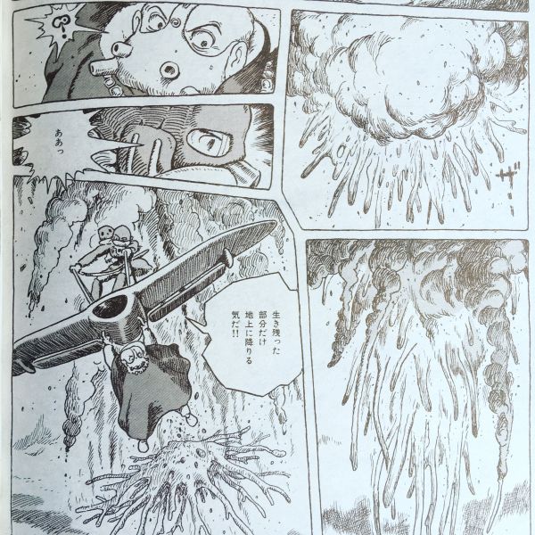 メーヴェの上から、ナウシカもチャルカも、はっきりとそれを見た、何本もの触手が雨のように地上へ、そしてその触手は、空で噴煙を上げつづける爆発を離れ、一つに固まって、巨大な根っこのように、「生き残った部分だけ地上に降りる気だ!」…